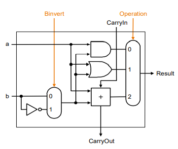 즉, inverter를 사용해 모든 b의 bit를 반대로 바꿔주고, 맨처음 ALU의 CarryIn에 1bit를 더해주면 2의 보수가 취해지는 것이다.