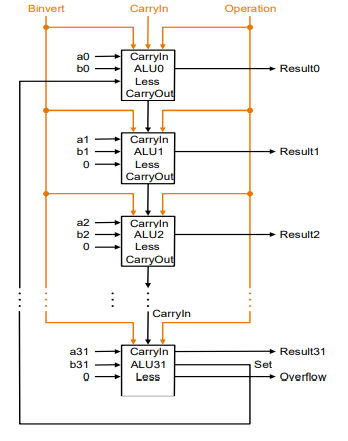 즉, slt 연산 실행 시 Multiplexer에 새로운 선택지를 넣어 첫번째 비트를 제외하고 모두 0을 입력한 후, 첫번째 비트만 마지막 1bit ALU에서 sign bit을 가지고 오면 된다.