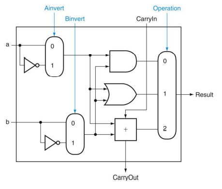 그럼 이제 and,or,add 연산을 한번에 수행하는 1bit ALU가 위와 같다는 것을 알 수 있다.