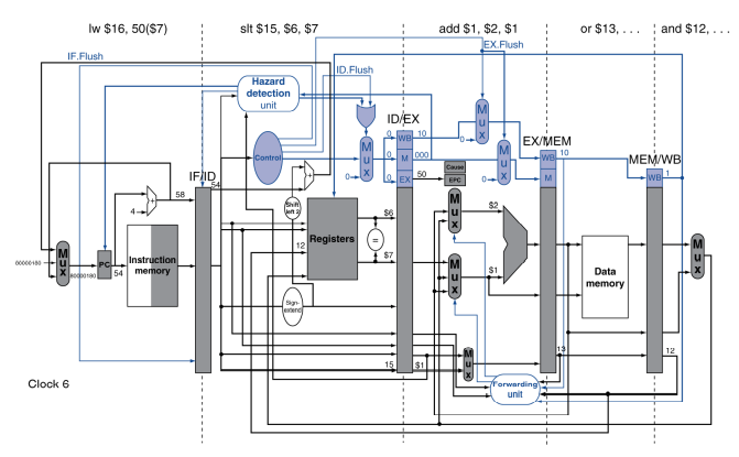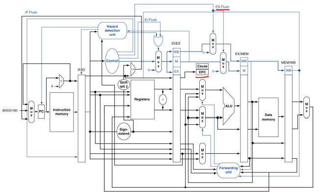분기 명령어때와 마찬가지로, Control 신호에 모두 0을 넣어 다음 명령어들을 Flush 시키고 예외 주소부터 다시 시작한다.