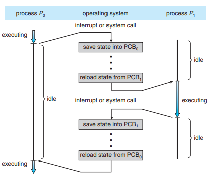 아래의 그림처럼 프로세스 각자의 문맥과 상태를 각자의 PCB에 저장 및 복원하며 프로세스들이 번갈아가면서 수행된다.