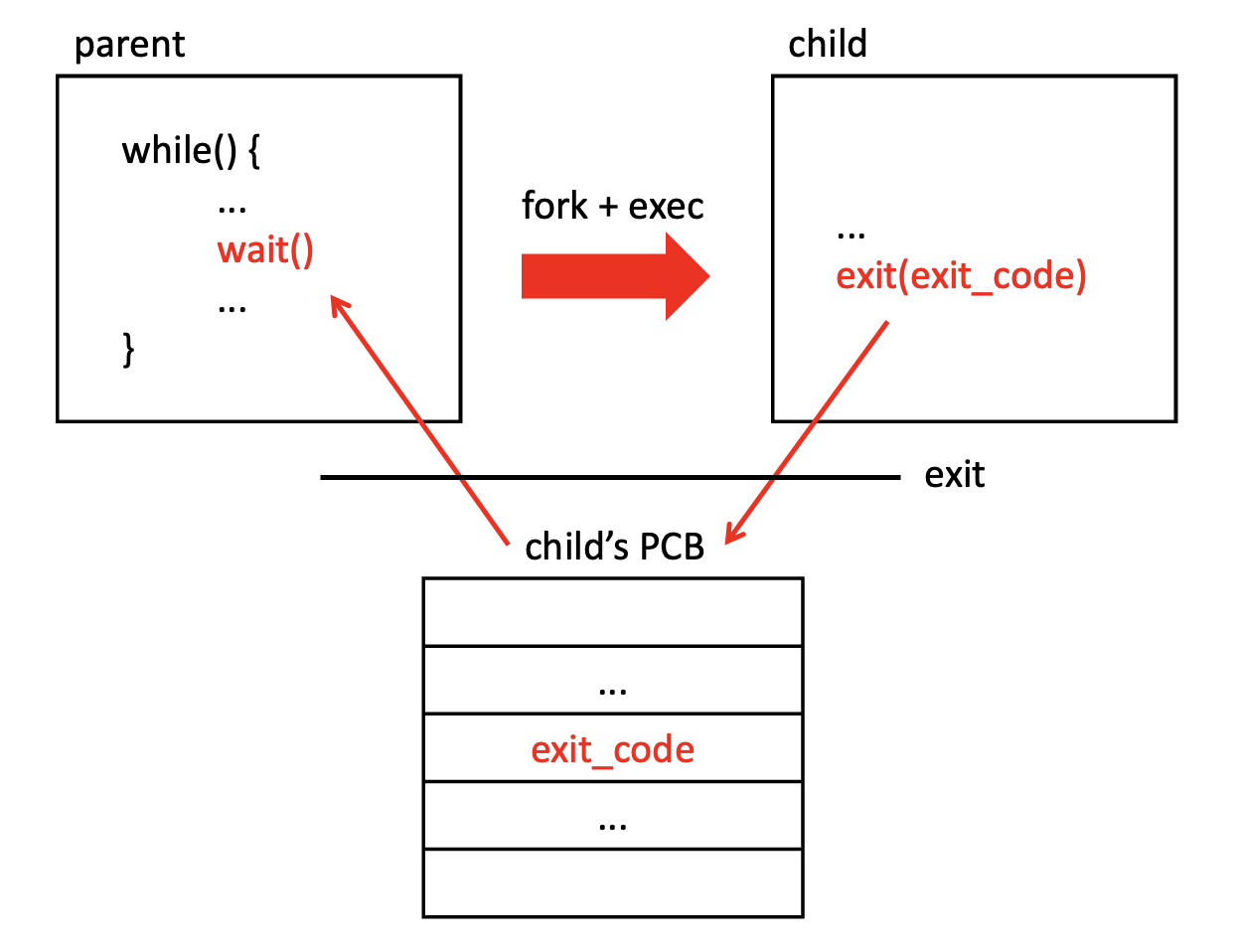 * 자식 프로세스는 자신의 부모 프로세스에 있는 wait() 시스템 호출을 통해 자신의 상태 값(exit code)을 반환할 수 있다.