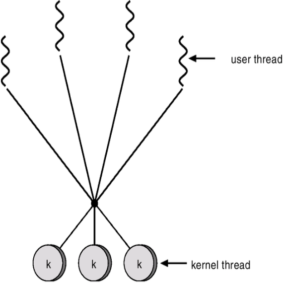여러 사용자 스레드 - 그보다 작거나 같은 수의 커널 스레드로 멀티플렉스(Multiplex)한다.