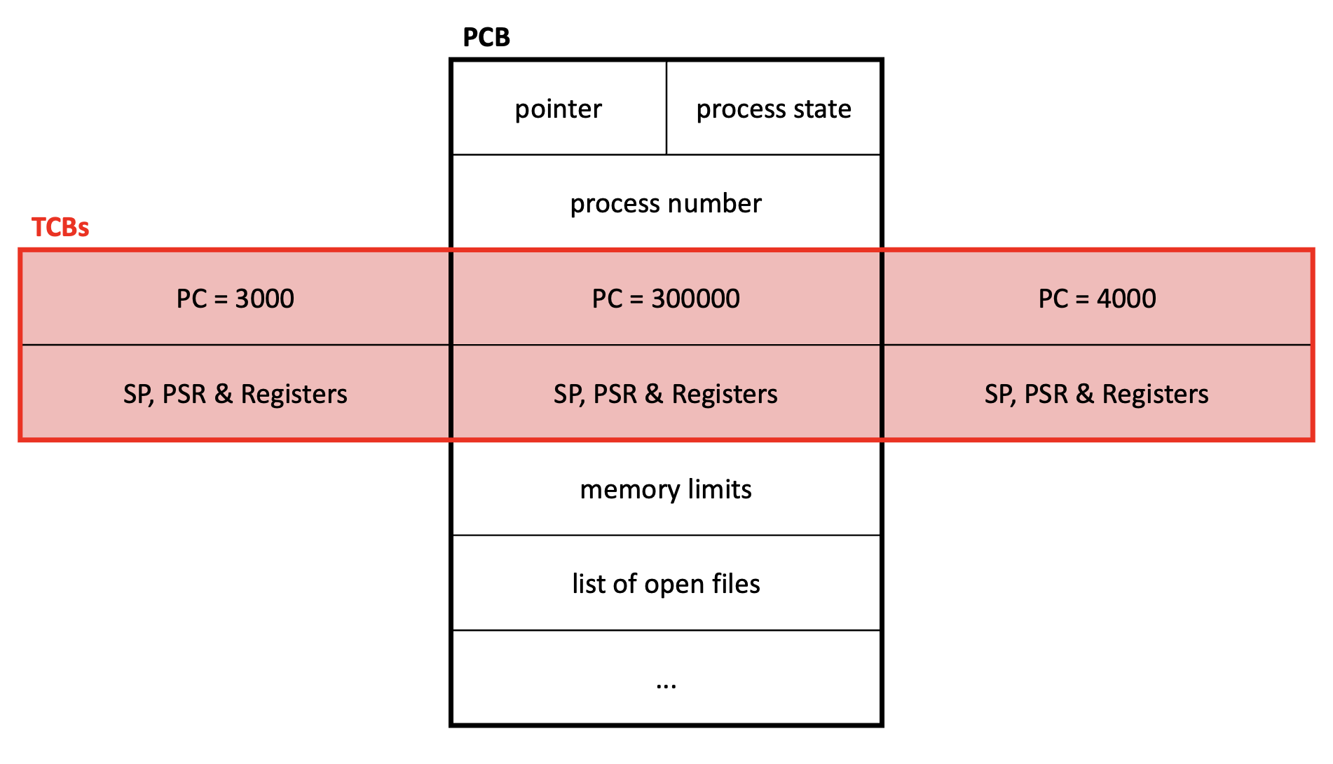 * PCB는 운영체제의 스케줄러에 의해 문맥 교환되는 프로세스의 정보의 단위이지만, TCB는 스레드 라이브러리에 의해 문맥 교환되는 스레드 정보의 단위이다.