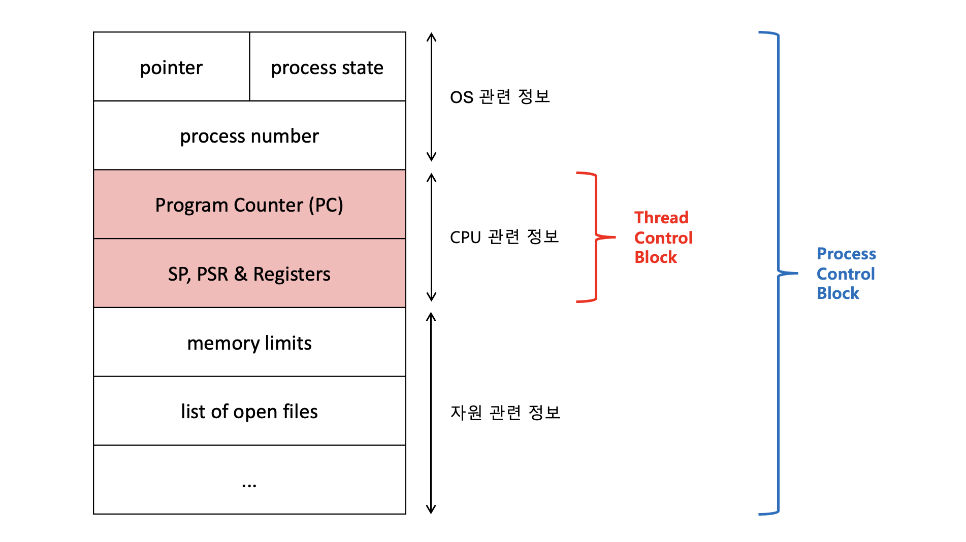 * PCB는 운영체제의 스케줄러에 의해 문맥 교환되는 프로세스의 정보의 단위이지만, TCB는 스레드 라이브러리에 의해 문맥 교환되는 스레드 정보의 단위이다.
