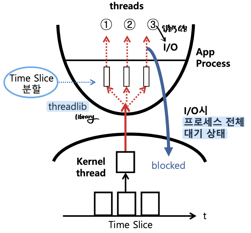 단점 : 한 스레드가 봉쇄 시스템 호출을 통해 대기 상태가 되어(ex. 입출력 요청) blocking 된다면 다른 스레드도 함께 block 된다.