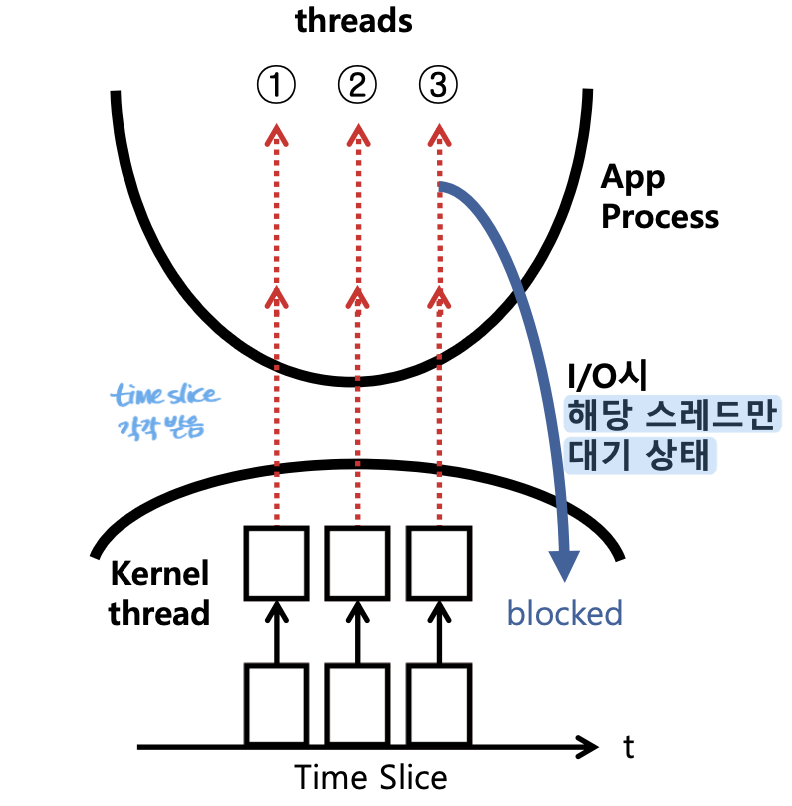 따라서 한 스레드가 봉쇄형 시스템 호출을 발생시켜 대기 상태로 들어갔을 경우 커널이 다른 스레드의 수행을 스케줄 할 수 있다