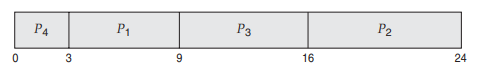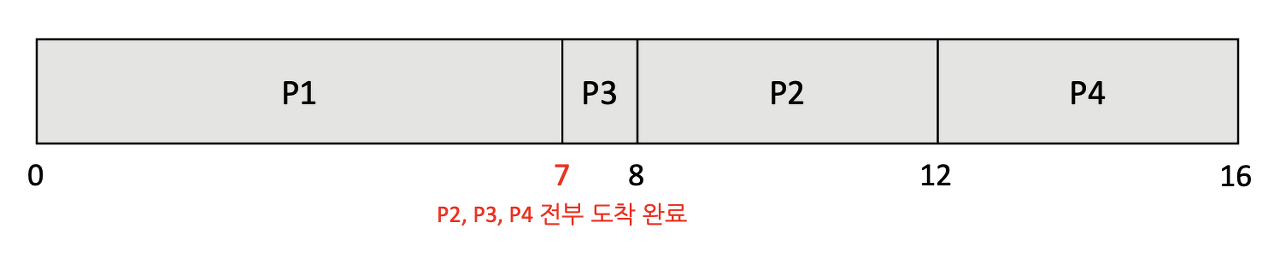 7초 이후에는 모든 프로세스들이 준비 큐에 있으므로 버스트 타임이 짧은 순으로 P3 P2 P4가 실행된다.