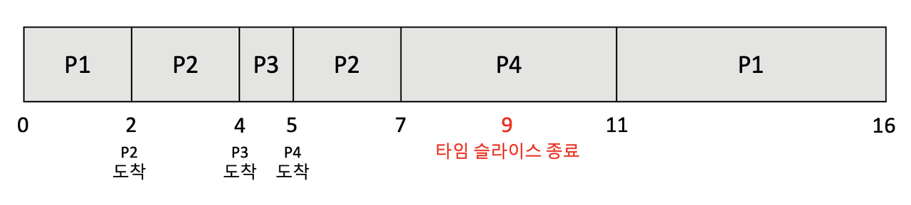 우선 준비 큐에 P1만 있으므로, P1이 먼저 실행되고, 타임 슬라이스가 소진되서(타임 슬라이스 소진 시 실행 중이던 프로세스가 준비 상태가 된다.) 다시 준비 큐의 프로세스들 중 스케줄링을 한다.
