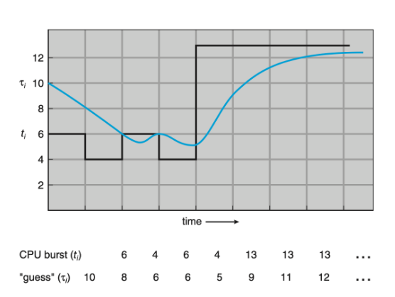 t n이 실제 n번째 CPU 버스트타임이고, τ n+1이 그 예상 값이라면 다음과 같이 정의한다.