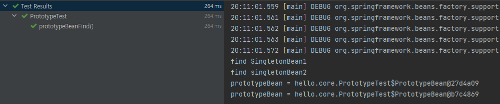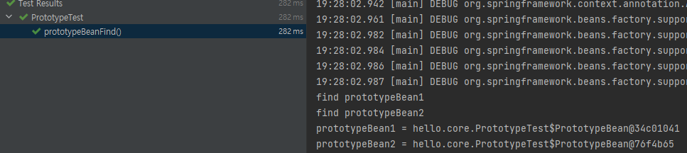 프로토타입 빈은 스프링 컨테이너는 해당 빈의 생성과 의존관계 주입까지만 관여하므로 똑같은 객체의 스프링 빈을 찾을 때는 스프링이 관리하고 있는 빈이 없으므로 새로 생성하여 생성할 때마다 새로운 빈이 나오게 된다.