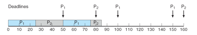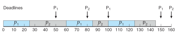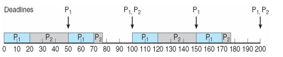 위 예시와 같이 p2가 전부 수행되기도 전에 p1이 CPU를 선점해버리고, p2에서는 데드라인 80을 지킬 수 없게 된다.