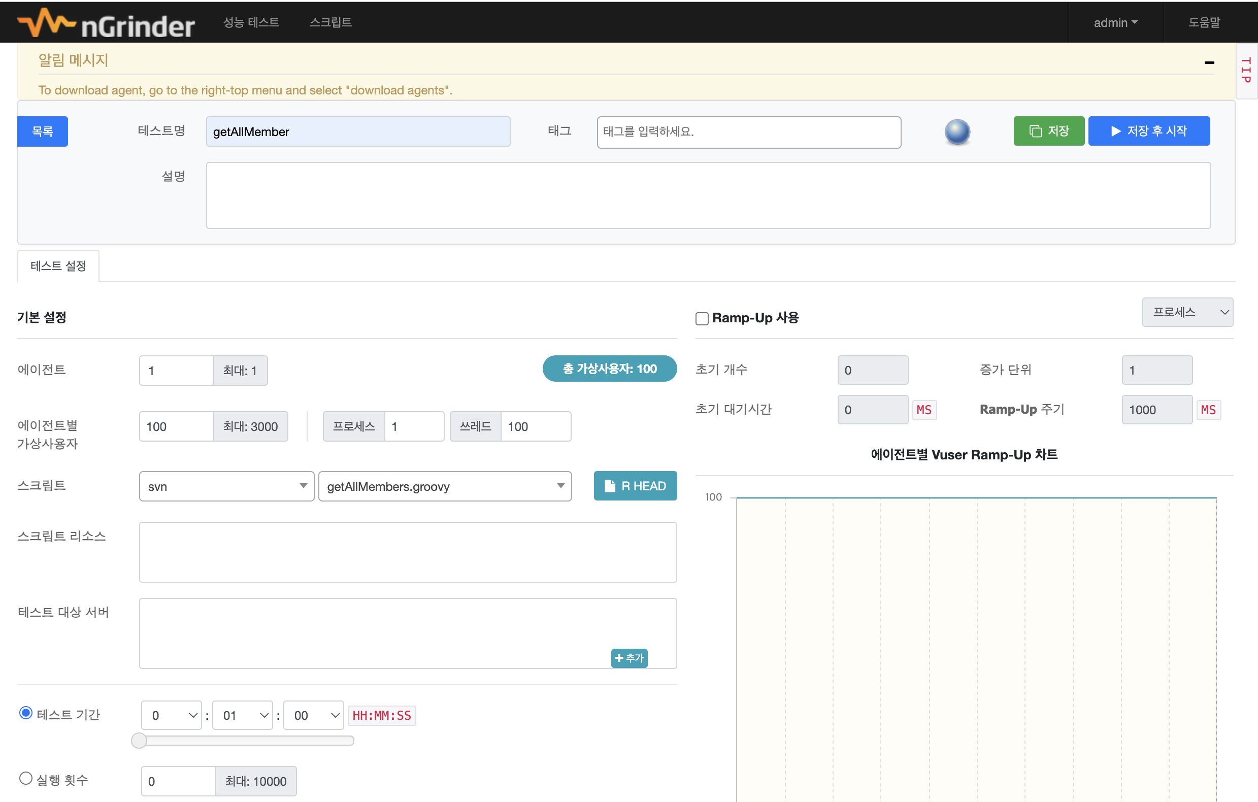 프로세스 * 스레드만큼 에이전트별 가상 사용자 수가 자동 설정된다.