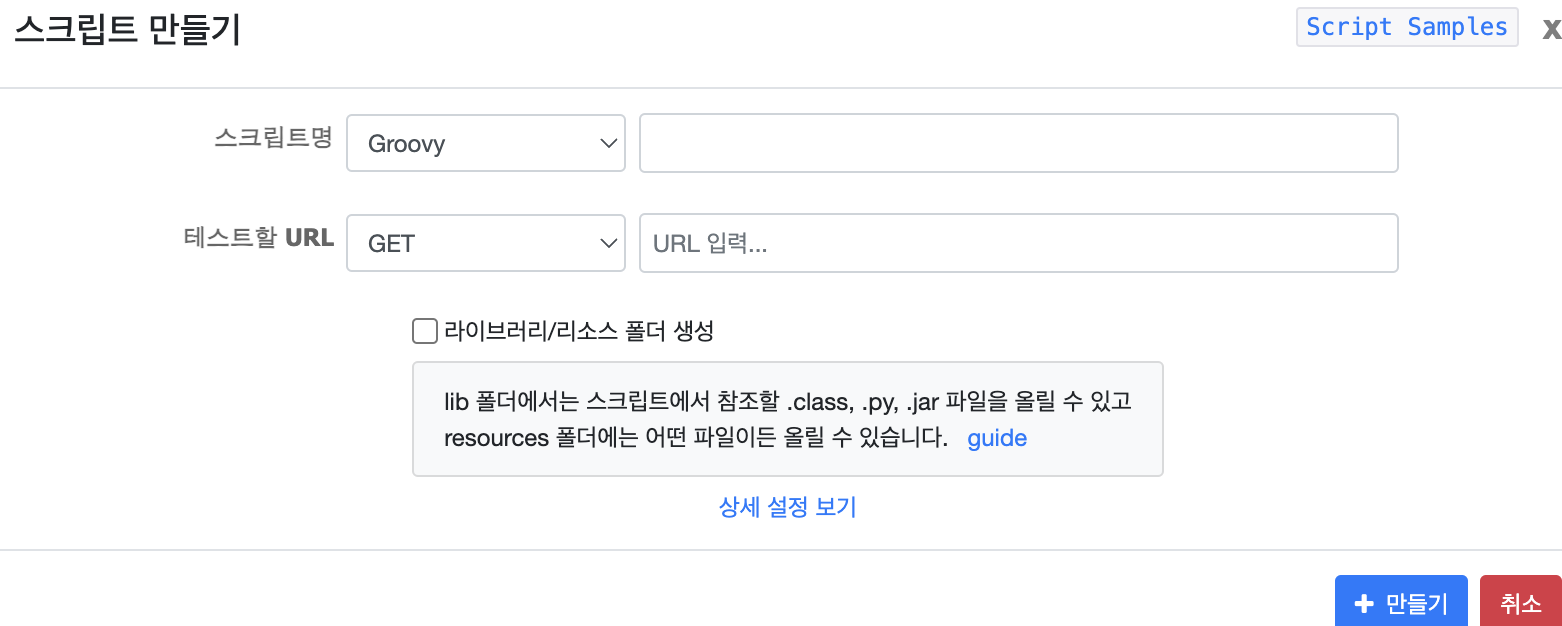 스크립트를 만들 때 테스트할 URL(API)을 입력해 주면 알아서 해당 요청에 대한 기본 템플릿 테스트 스크립트를 만들어준다.