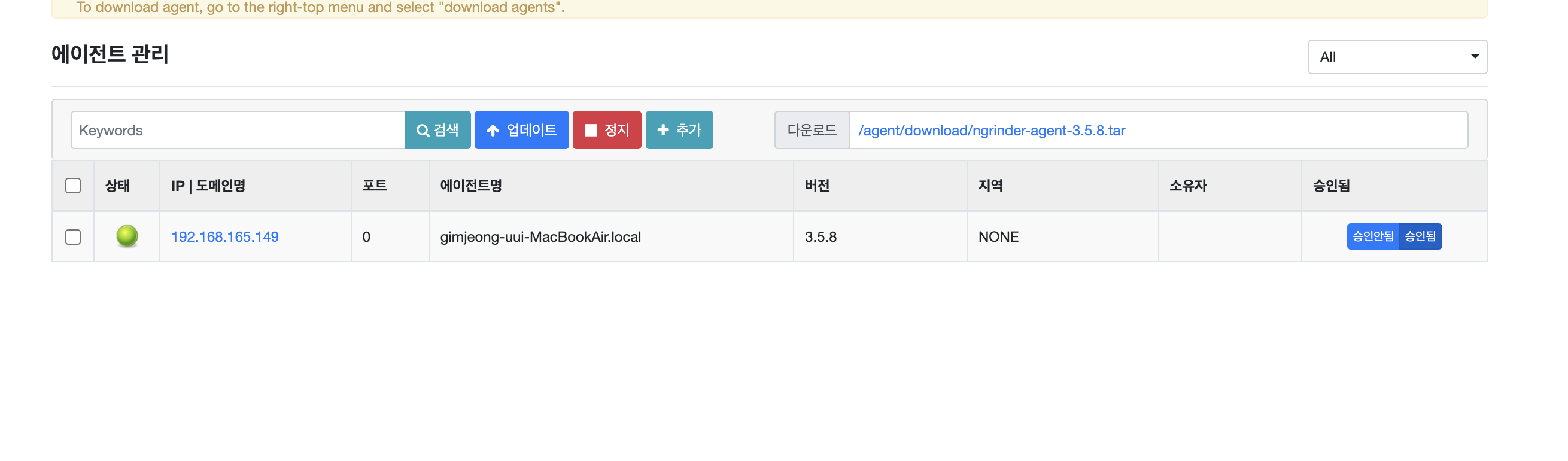 아래와 같이 계정 -> 에이전트 관리에 들어가면 실행 중인 에이전트도 확인할 수 있다.