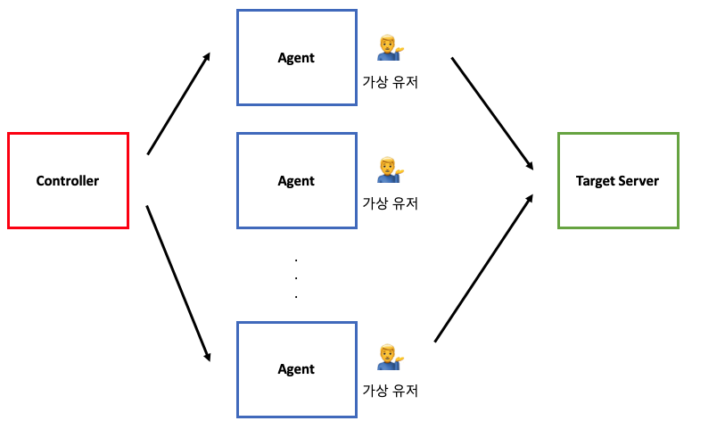 controller와 Agent의 서버는 모두 부하를 발생하고 모니터링 하는 데 있어 각각 CPU와 메모리 등의 서버 자원을 소모한다. 만약 이들이 하나의 서버에 존재한다면 서버는 자원을 나눠서 사용해야 하고, 그만큼 Context Switching 이 발생하는 등 테스트에 있어서 불필요한 노이즈가 발생하게 되기 때문에 순수한 Target 서버의 성능을 도출하기 어려워지기 때문에 다른 서버에 두는 것을 권장한다.
