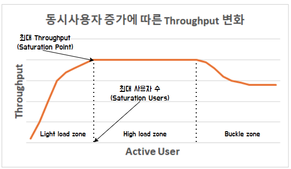 - vUser가 증가함에 따라 Throughput이 한계에 도달하면 현 상태의 최대 처리량으로 추정할 수 있다. 단, 실제 서비스의 성능은 이보다 더 적을 수도 있다.