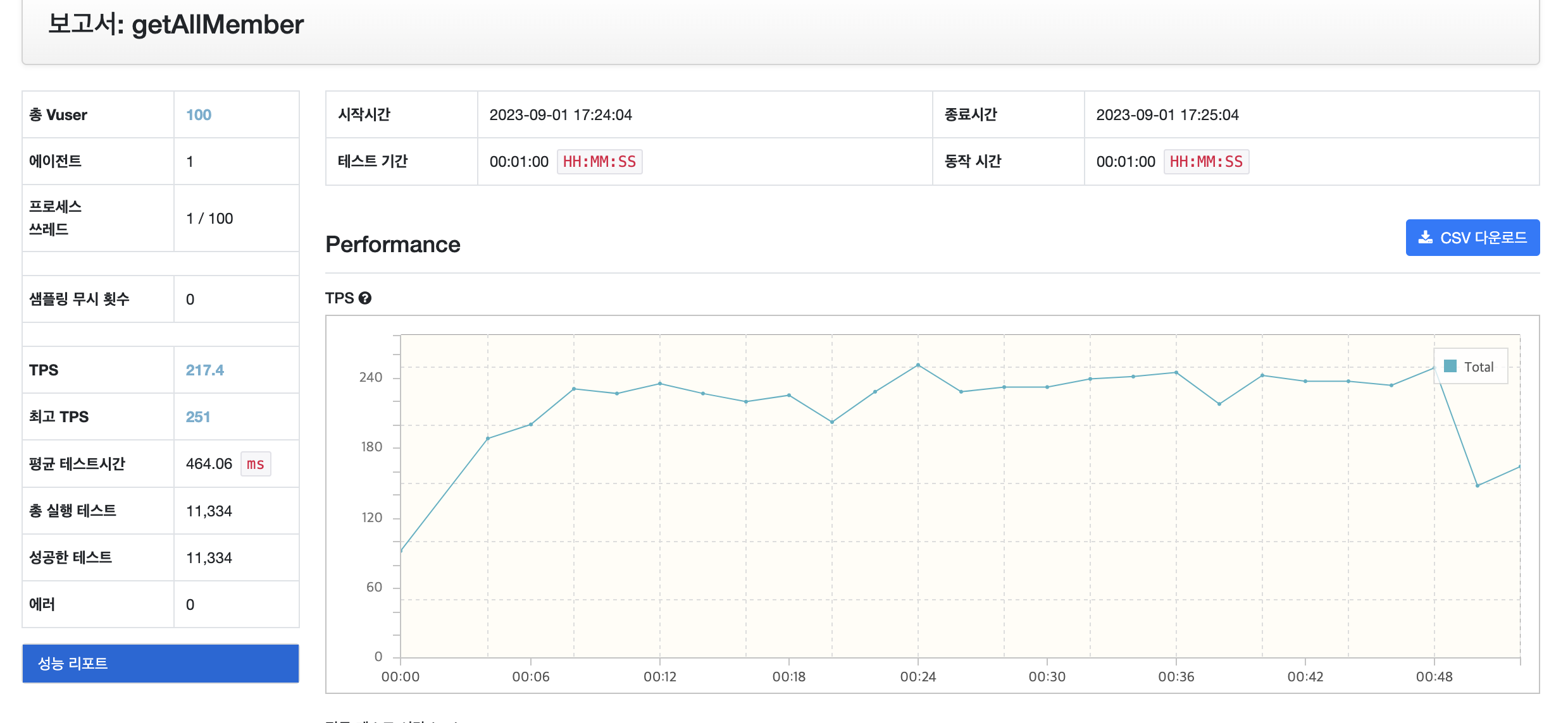 위 표를 보면 알 수 있듯이 현재 vUser가 증가해도 TPS는 200 대로 유지가 되는 것을 보면 High Load Zone에 도달하여 현재 테스트한 API에 대한 시스템 성능은 약 250 정도의 TPS라고 예상할 수 있다.