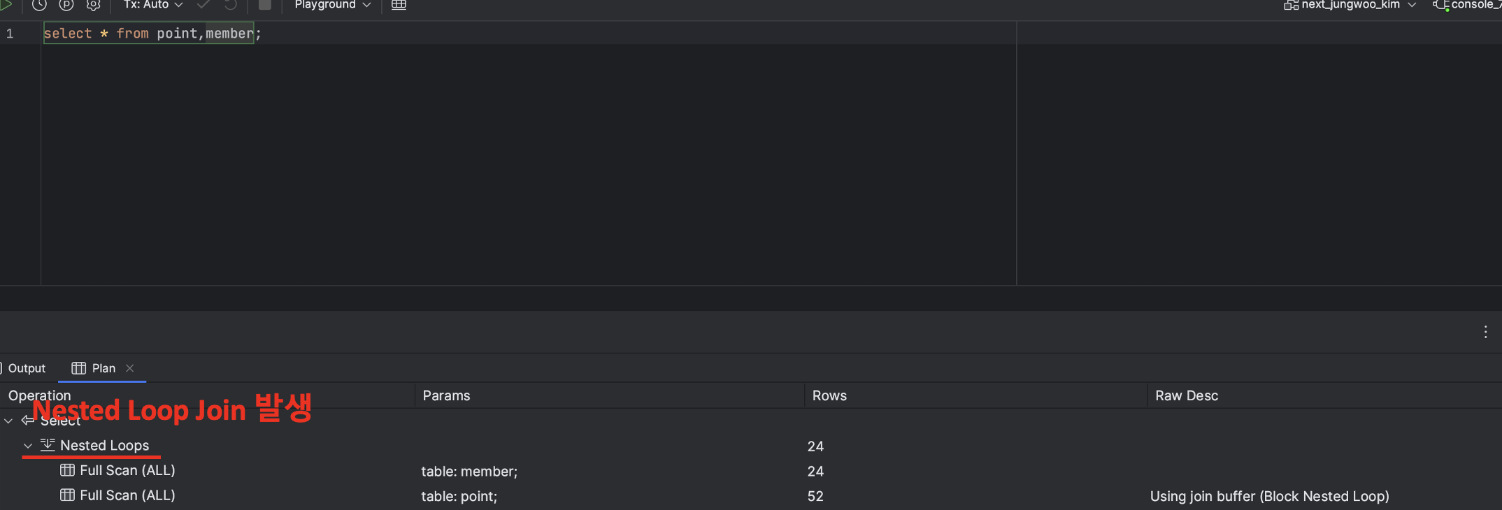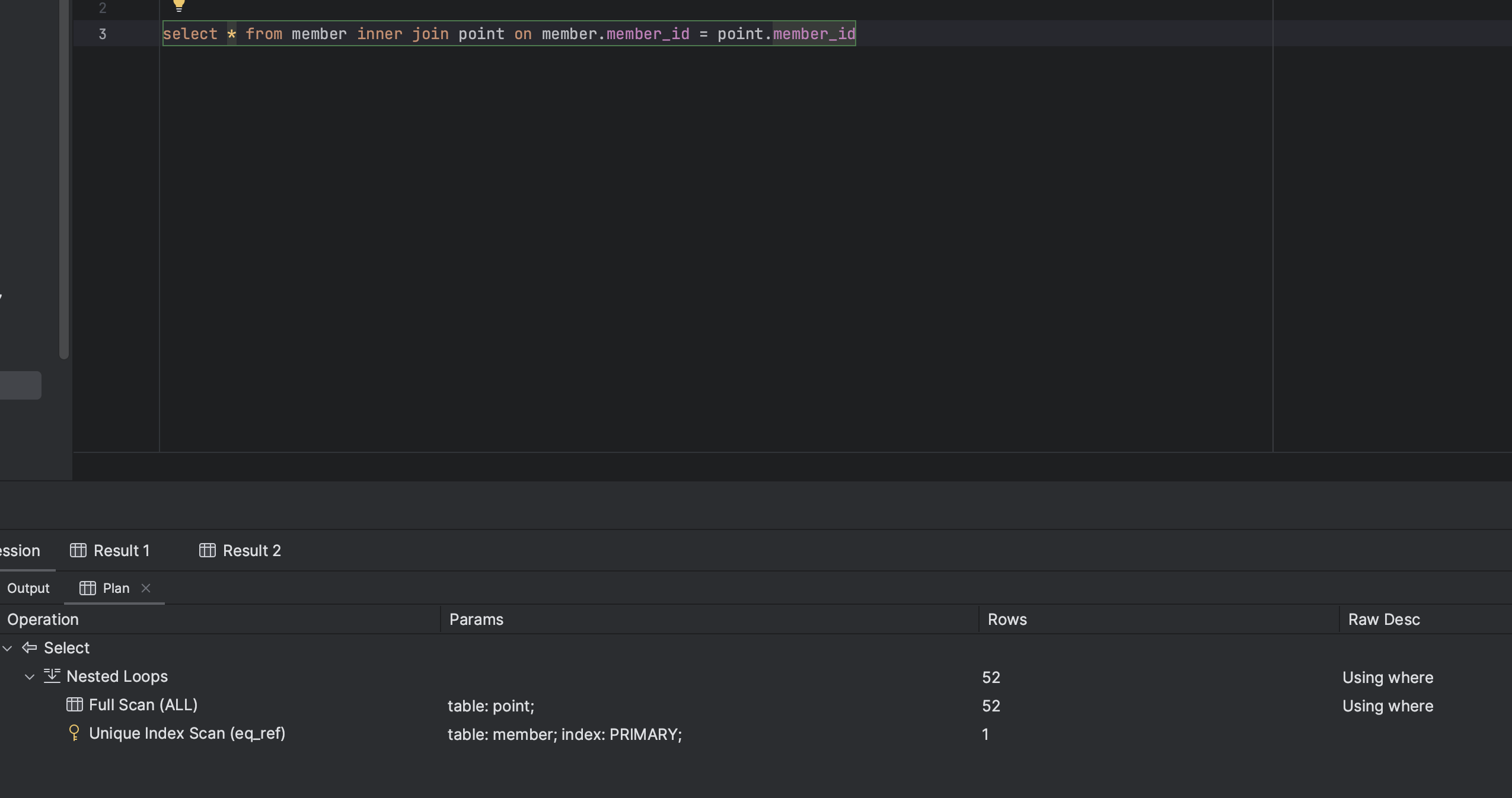 실제 Mysql에서도 더 큰 테이블이고 다쪽인 Point를 구동 테이블로 잡아 FullScan이 일어난 것을 볼 수 있다.