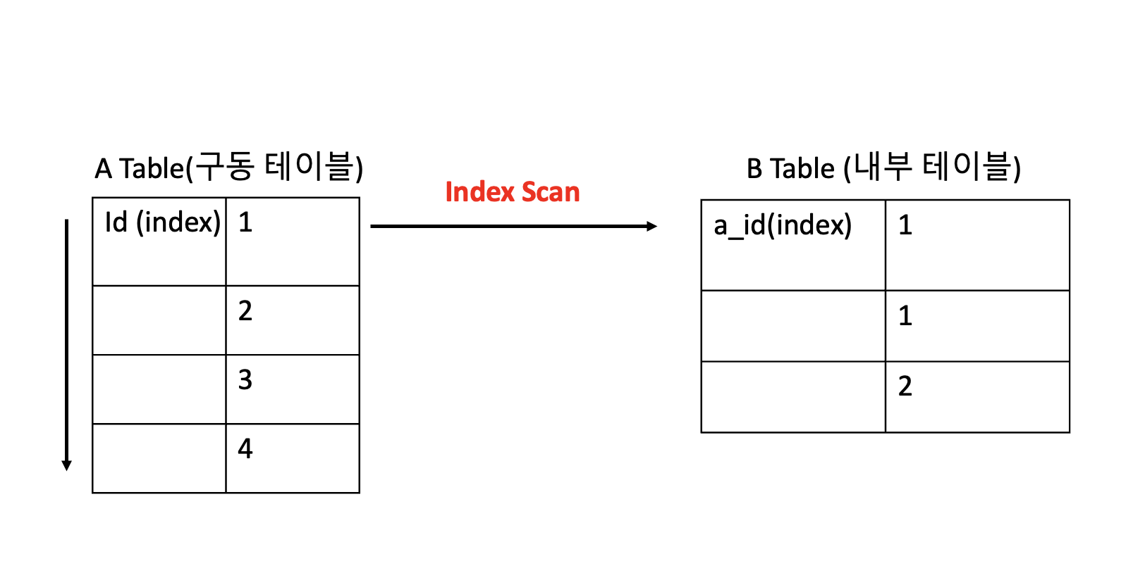 내부 테이블에 인덱스가 있게되면 내부 테이블을 반복해서 돌 필요 없이 인덱스를 통해 해당 값이 있는지 확인하면 그만이다.