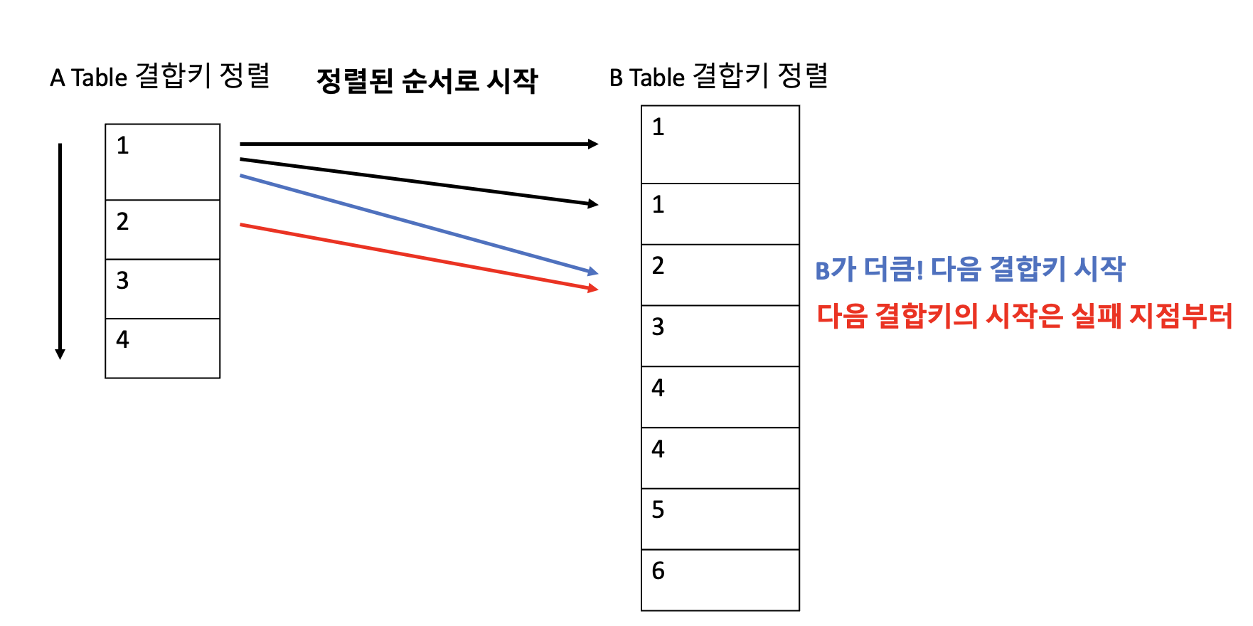 - 결합 키가 정렬되어 있는 상태라면(인덱스) 정렬을 생략하기도 한다. 다만 SQL에서 테이블에 있는 레코드의 물리적인 위치를 알고 있을 때 가능해서 이러한 생략은 구현 의존적이다.
