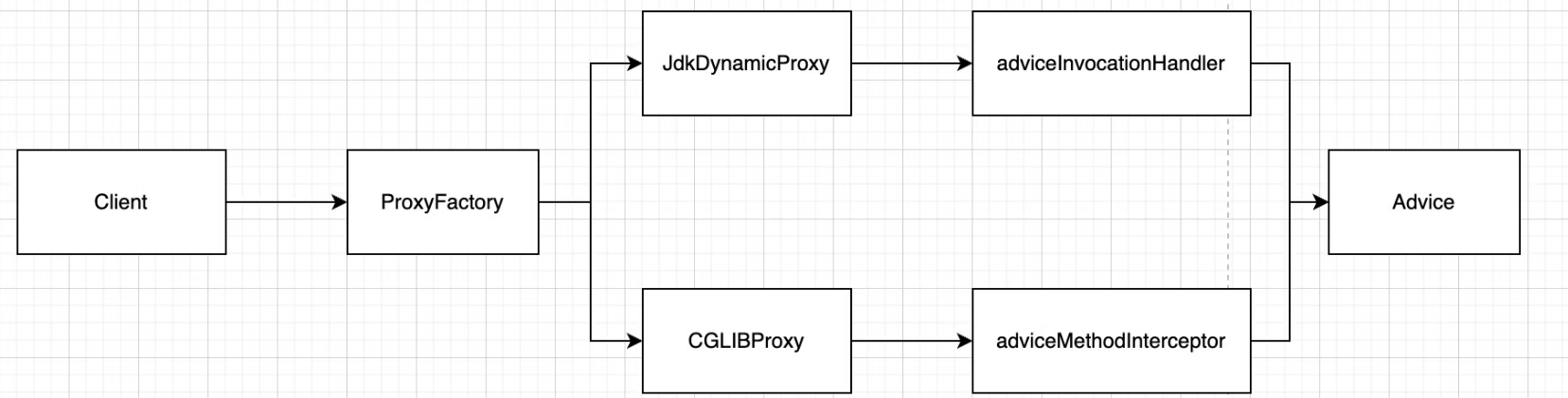 Advice라는 인터페이스로 부가기능을 추상화하고 InvoicationHandler 인터페이스의 구현체 AdviceInvocationHandler 혹은 CGLIB에서는 MethodInterceptor 인터페이스를 구현하는 AdviceMethodInterceptor를 통해 전달받은 Advice를 실행하도록 한다.