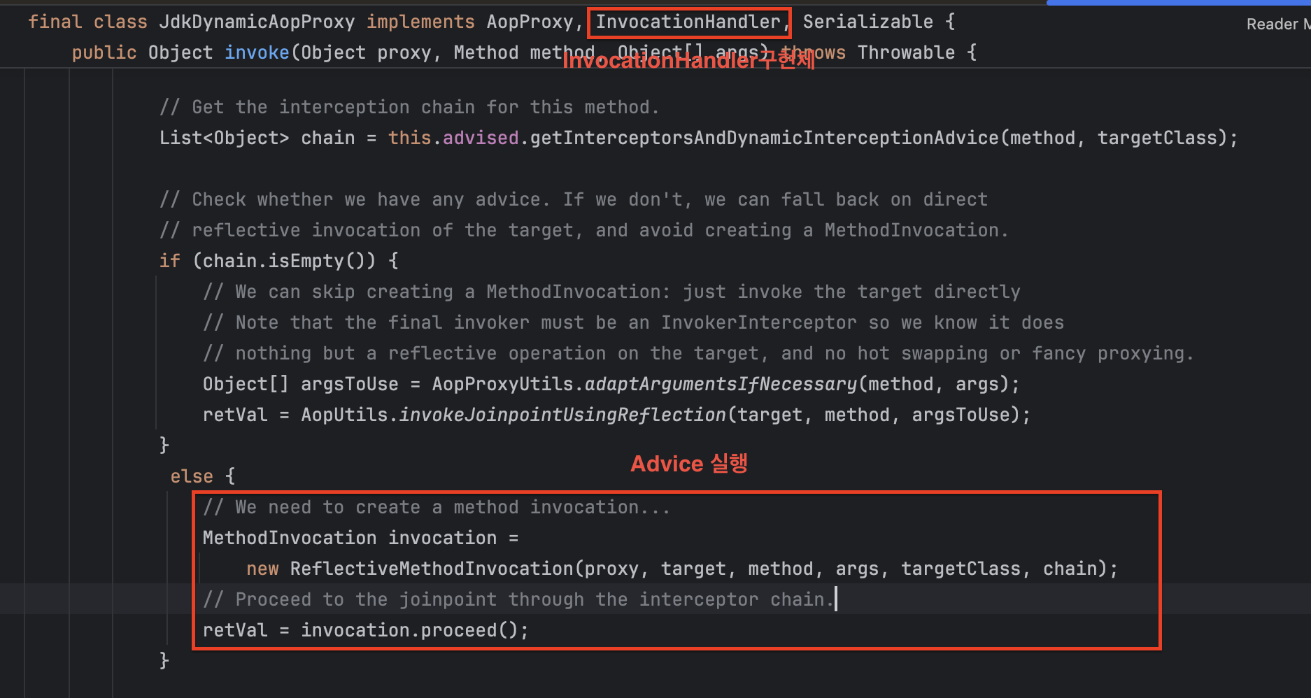 위에서는 AdviceInvocationHandler라고 칭했지만, 실제로 InvocationHandler 구현체인 JdkDynamicProxy 클래스를 들어가보면 다음과 같이 invoke할 때 advice들을 실행시켜주는 것을 볼 수 있다.