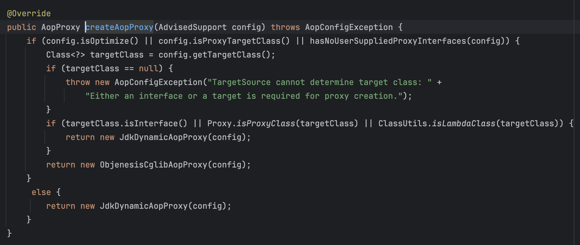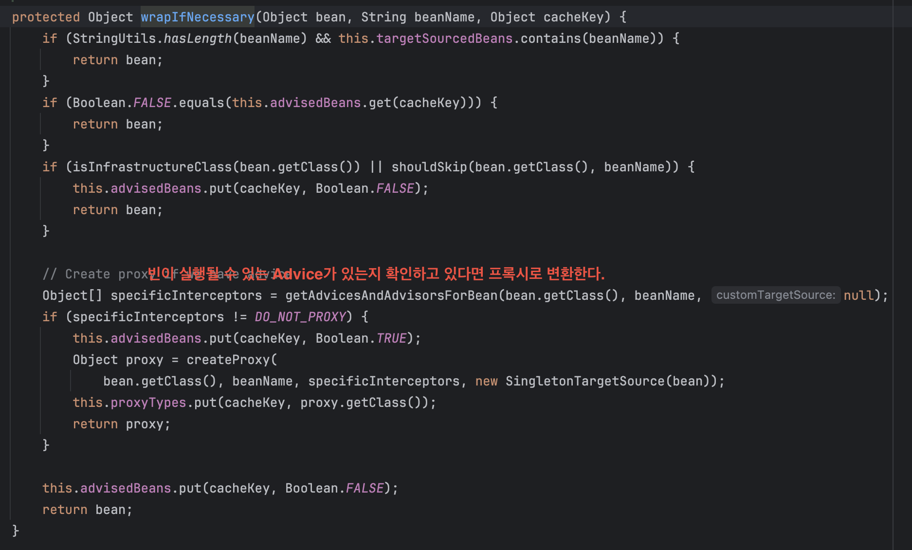 위 메서드를 통해 빈 메서드 실행 시에 실행될 수 있는 Advisor가 있는지 찾고 없다면 자기 자신을 그냥 return하고 있다면 빈을 프록시로 변환하여 반환한다. 프록시를 만들 때는 당연히 실행될 수 있는 Advisor들만 전달하여 프록시를 만들어준다.