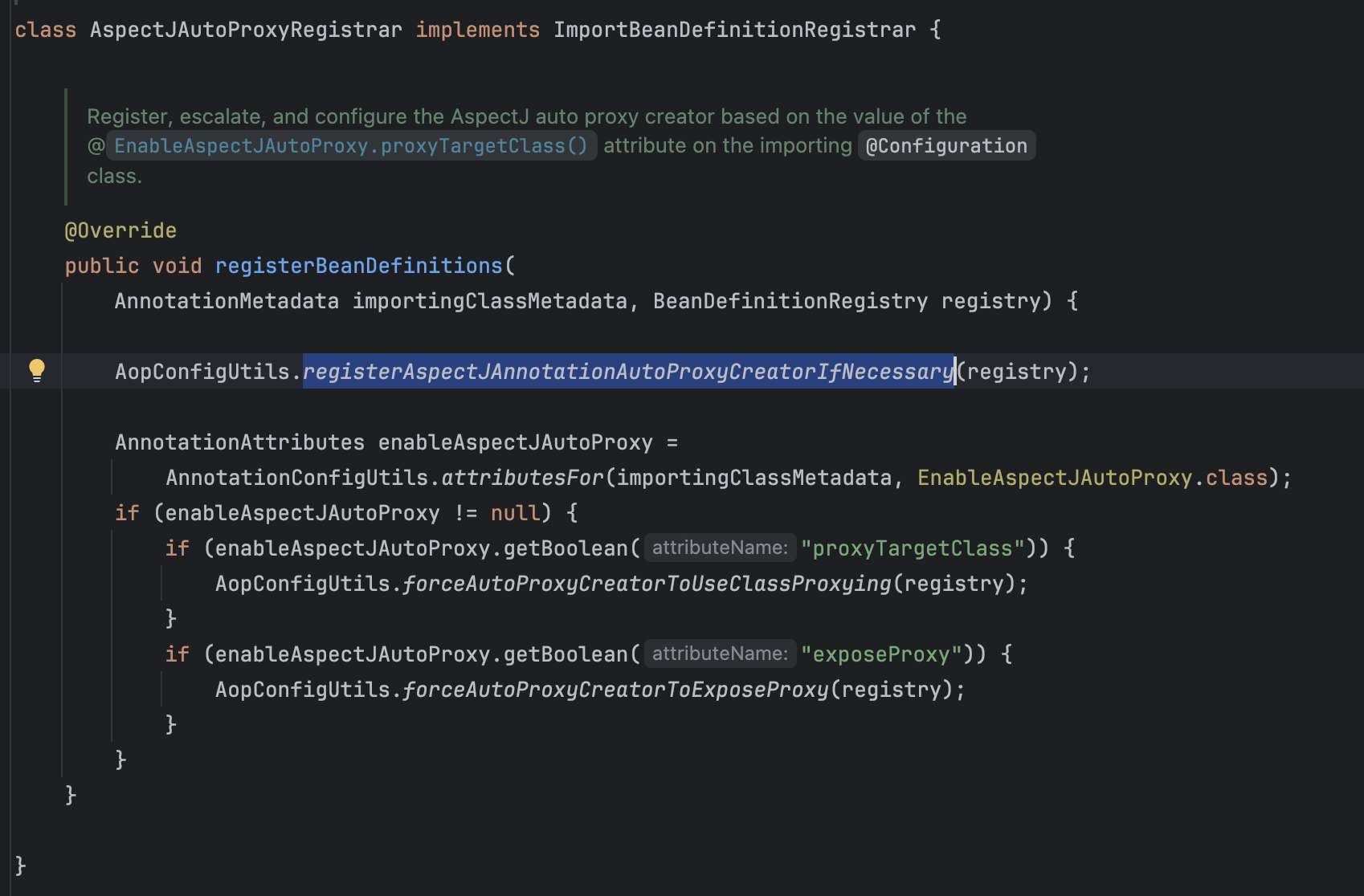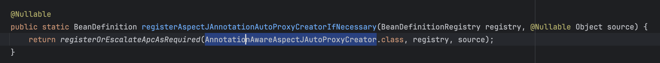 해당 클래스에서 AOP 기능을 위해 AspectJAnnotationAutoProxyCreator가 빈으로 등록된다.