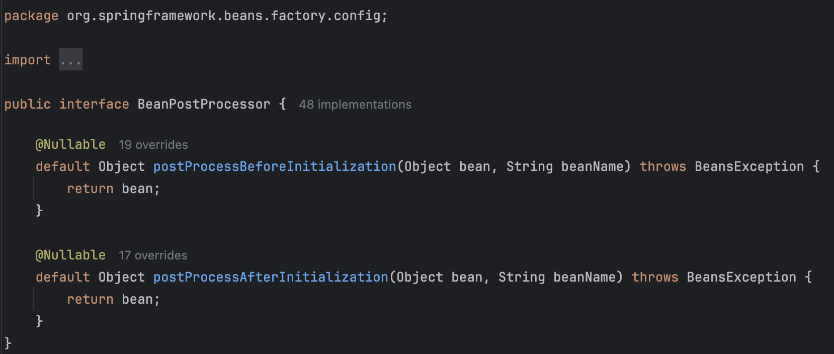 BeanPostProcessor 인터페이스는 다음과 같다.