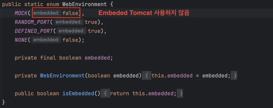 @SpringBootTest의 기본 설정인 WebEnvironment.Mock은 WebApplicationContext를 실제로 로드하긴 하지만 SpringBoot의 Servletcontainer인 내장 톰캣이 구동되지 않고, 서블릿을 Mocking한 것이 동작한다. 즉, 실제 네트워크 요청을 받지 않는다.