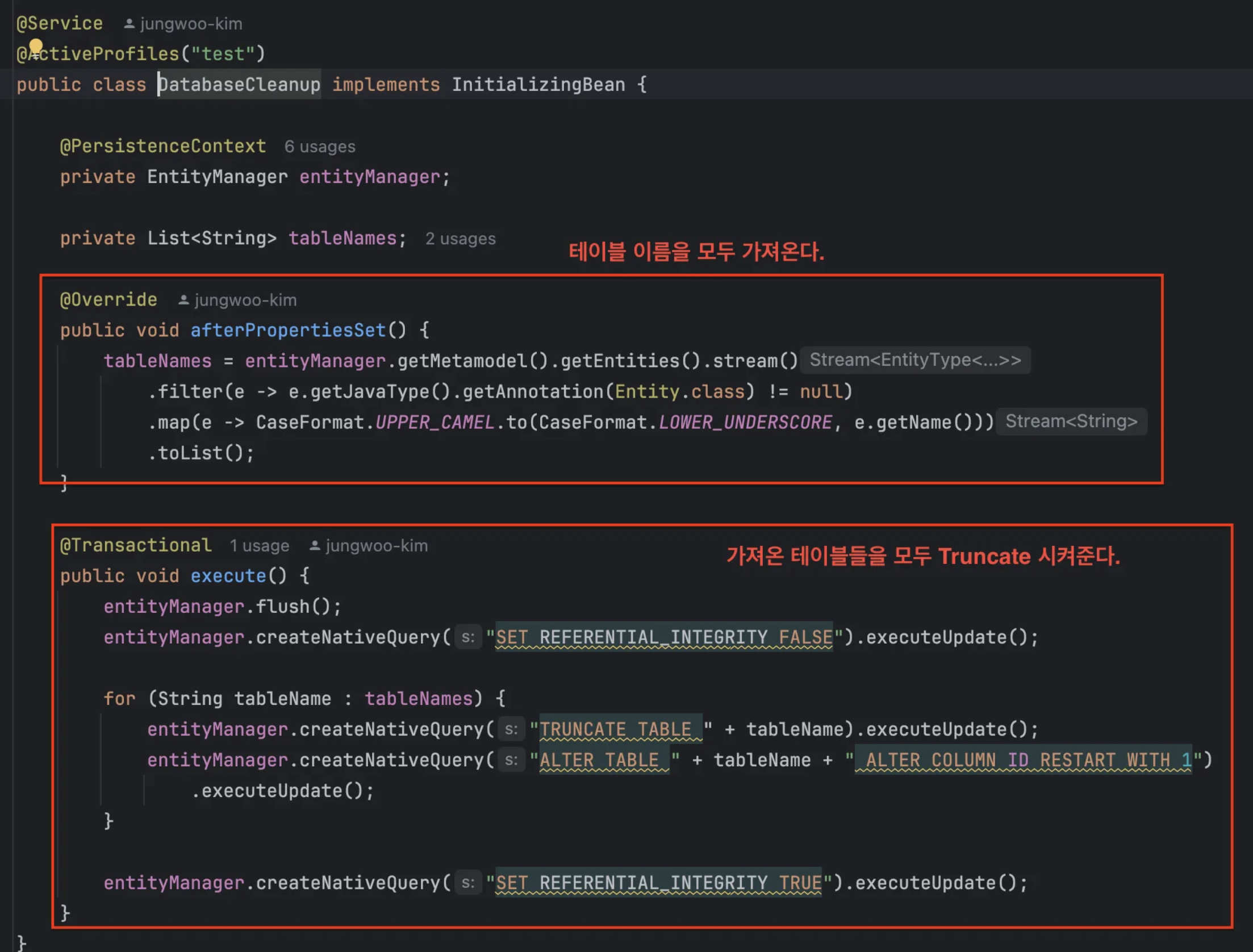 모든 테스트마다 위처럼 의존성 주입, @BeforeEach에서 실행해줄 수도 있겠지만 이는 모든 통합 테스트에서 실행될 공통의 관심사로 보인다.