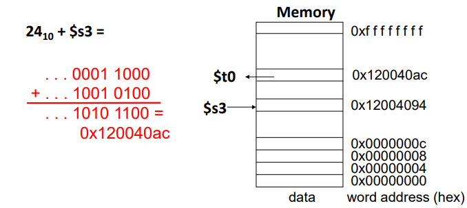 이후 24에 $s3에 담겨 있는 값을 더한 것이 목적지 address가 되고, 그곳에 담겨있는 값이 $t0에 저장되는 것이다.