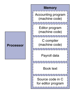 프로그램과 데이터를 메모리에 적재하고 컴퓨터한테 어떤 위치에서 실행할지 알려주면 이런 전환이 일어난다. 명령어를 2진수의 데이터와 똑같이 취급함으로써 컴퓨터 시스템의 메모리 하드웨어와 소프트웨어가 모두 간단해진다. 즉, 데이터 저장을 위해 개발된 메모리 기술이 프로그램 저장에도 그대로 사용되며, 컴파일러 같은 프로그램이 인간에게 편리한 형태로 작성된 코드를 컴퓨터가 이해할 수 있는 코드로 바꿀 수 있는 것도 이 특성 덕분이다.