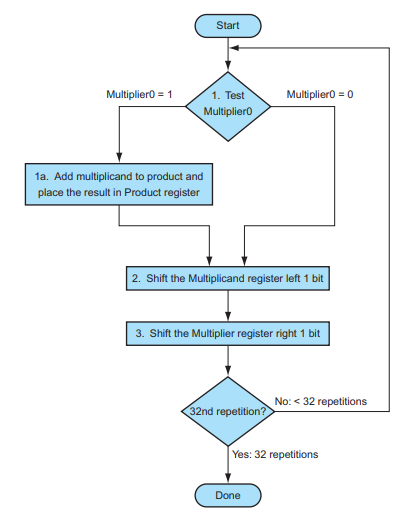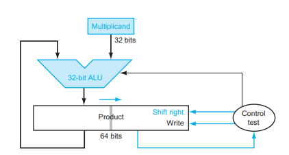 Multiplicand는 64bit로 초기엔 좌측의 32bit가 0으로 초기화 되어있어 원래의 Multiplicand수 그대로를 나타내고 이후 한번 연산이 진행될 때마다 shift left되어 자릿수가 하나 증가된다.