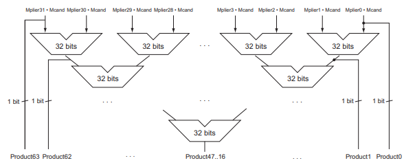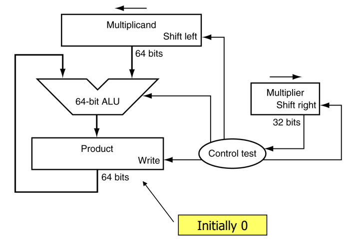 Multiplicand는 64bit로 초기엔 좌측의 32bit가 0으로 초기화 되어있어 원래의 Multiplicand수 그대로를 나타내고 이후 한번 연산이 진행될 때마다 shift left되어 자릿수가 하나 증가된다.