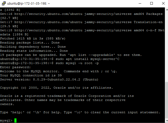 를 입력하고 비밀번호를 입력하면 mysql에 접근할 수 있다.