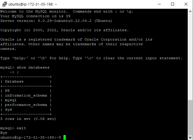 mysql에서 나오려면 exit 를 입력해야 한다.