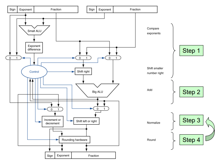 부동 소숫점 덧셈은 정수 덧셈보다 더 복잡해서 더 많은 clock cylcle이 걸린다는 점을 알고 있도록 하자.