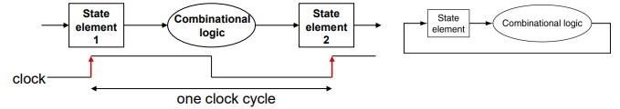 state element(레지스터 등등)로 부터 값을 읽어오고 읽어온 값을 combinational logic에서 계산하고, 나온 결과를 다른 state element(레지스터 등등)에 전달 해주어야 한다.