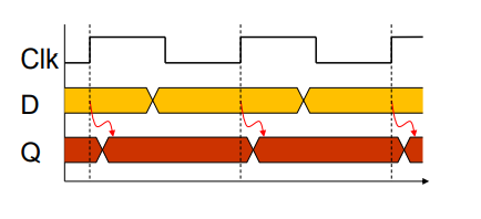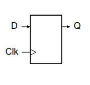Sequential Elements는 최소 두개의 입력과 1개의 출력을 갖는데, 하나의 입력은 데이터(D)이고, 하나의 출력은 데이터에 따른 값(Q) 이다. 나머지 하나는 클럭(clock)이라고 하는데, 데이터 값이 소자에 기록되는 시점을 결정한다.
