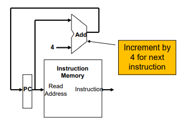 프로그램 카운터(PC)는 현재 명령어의 주소를 갖고 있고, 매 클럭 사이클마다 PC에 4 값이 더해져 다음 명령어의 주소를 갖게 된다.