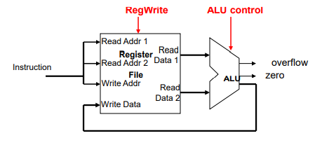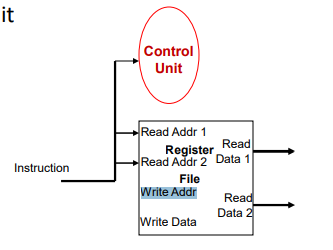 명령어의 형식을 보면 add t1,t1, t1, t2, $t3처럼 어떤 레지스터로부터 값을 읽고, 어떤 레지스터에 값을 쓸 건지 정해야 하는데, 이를 위해 레지스터 파일에도 rs (Read Addr 1) rt(Read Addr 2) rd(Write Addr) 필드의 값과 어떤 값이 쓰일지 데이터(Write Data)를 보낸다.
