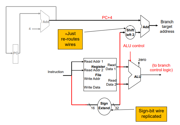 따라서 ALU의 빼기 연산을 사용하여 0인지 아닌지 판단하고 이 값을 바탕으로 Branch control unit에 전달하여 PC+4를 쓸지 계산한 Label주소를 쓸지 결정한다.