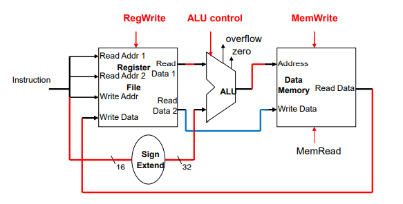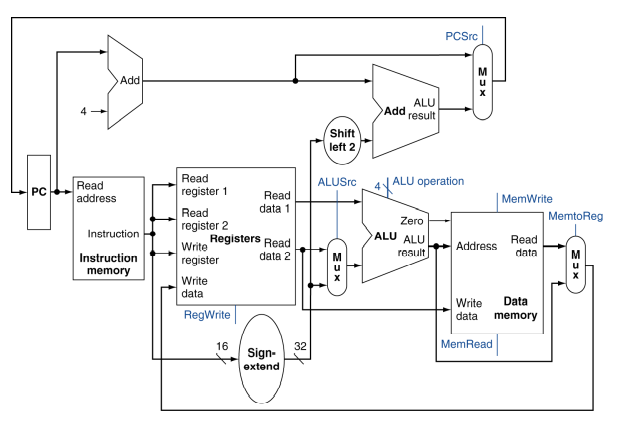 데이터패스란 CPU안에서 데이터와 주소, 레지스터의 처리 및 연산을 하는 모든 요소를 의미한다 (instruction memory, data memory, PC, Register file, ALU 등 ..)