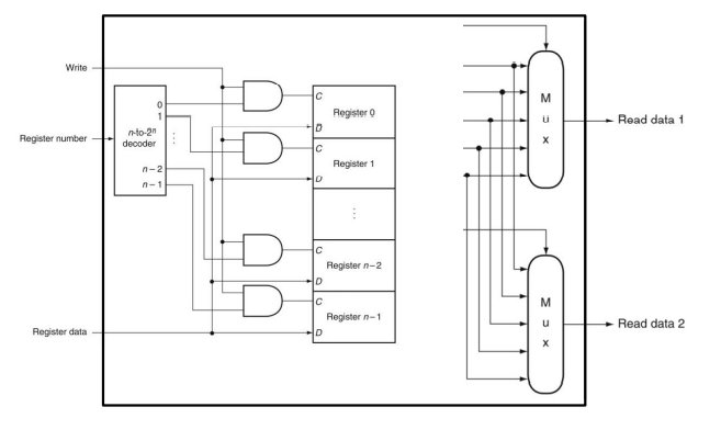 Write 할 때는 write 할 레지스터의 번호만 1로 출력하고 나머지는 0으로 출력하는 Decoder와 WriteContol 신호를 이용해서 어떤 레지스터에 값을 쓸 건지 레지스터에 write 하는 명령어가 맞는지 And게이트에 넣어 만약 둘 다 맞을 시 control 신호에 1을 넣어 해당 레지스터에만 값이 쓰이게끔 한다.