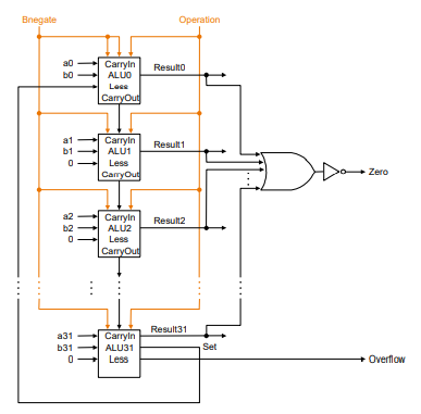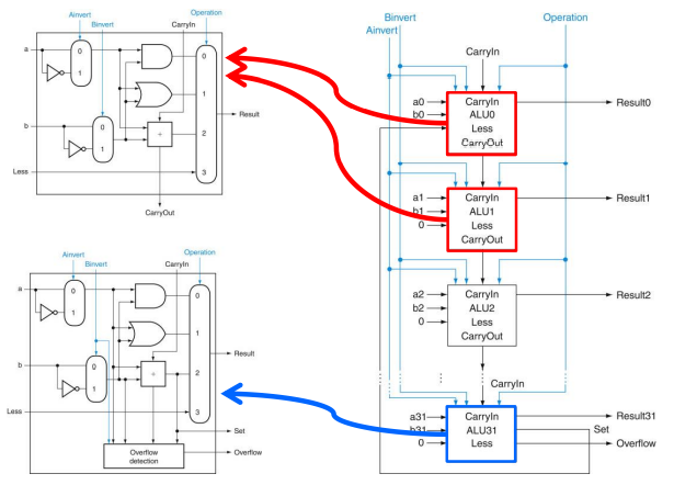 즉, slt 연산 실행 시 Multiplexer에 새로운 선택지를 넣어 첫번째 비트를 제외하고 모두 0을 입력한 후, 첫번째 비트만 마지막 1bit ALU에서 sign bit을 가지고 오면 된다.