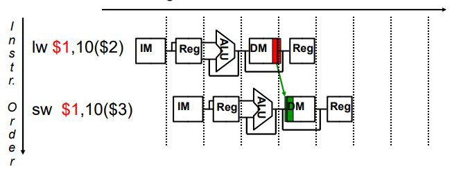 예를 들어서 다음과 같이 하나의 메모리에 동시에 접근하게 될 때 structural hazards가 생긴다.