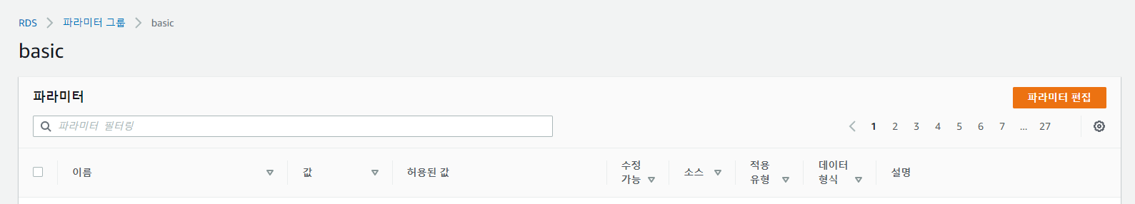 이제 옆에 파라미터 편집을 눌러서 파라미터 그룹 설정을 해주어야한다.