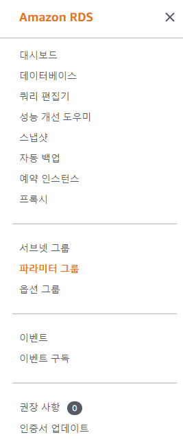 다음과 같이 파라미터 그룹 탭에 접근한 뒤, 우측 상단의 파라미터 그룹 생성 버튼을 통해 파라미터 그룹을 생성하도록 한다.